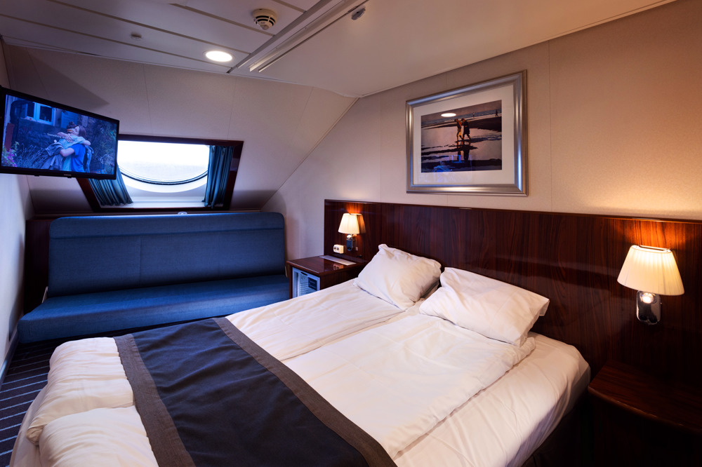 4 sengs udvendig kahyt 4 køjesenge, vindue og et loftmonteret TV.