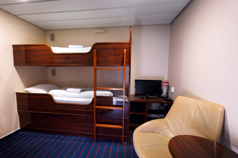 Indvendig 2-sengs kahyt med 2 køjesenge, lille skrivebord og stol.