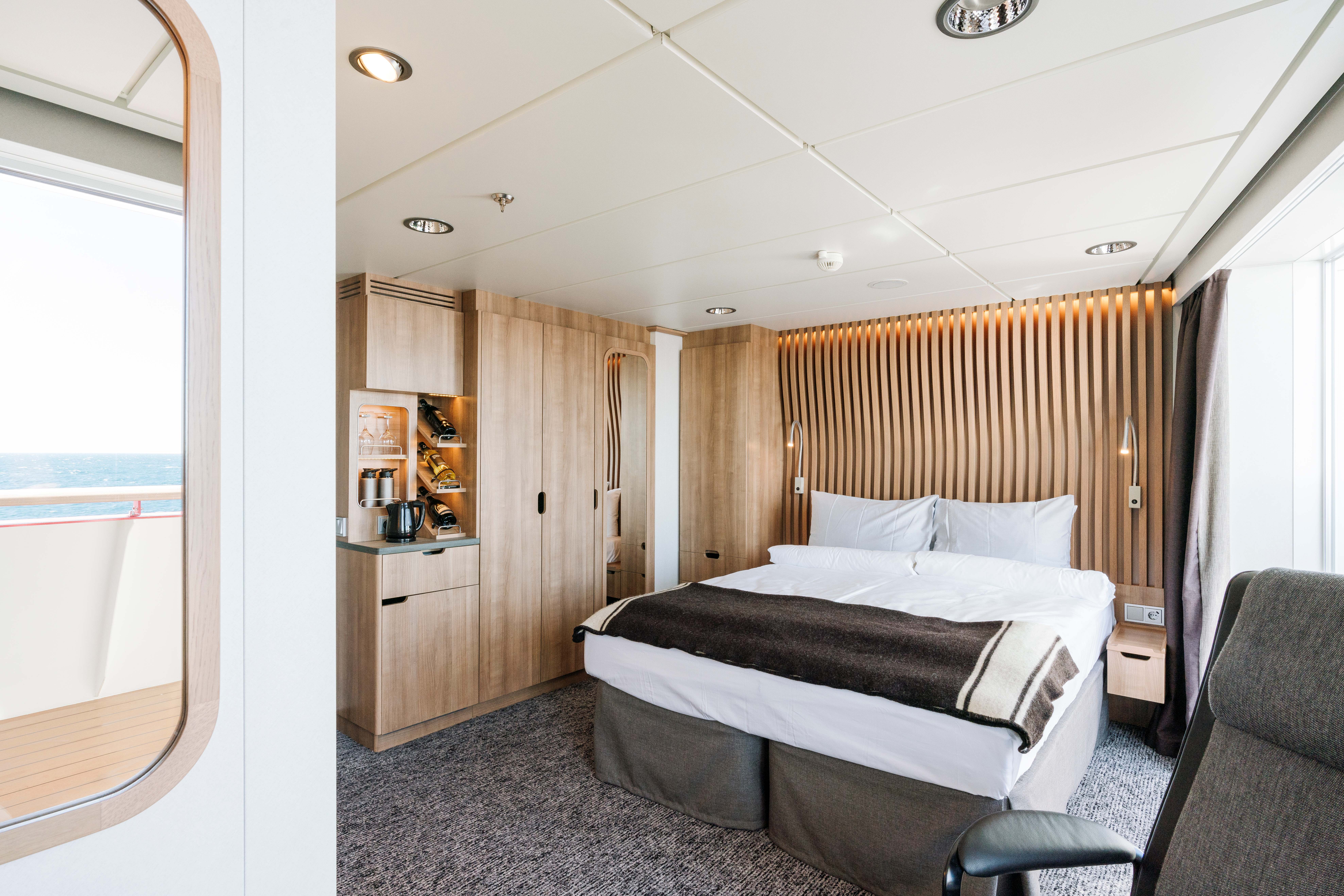 Kategori XTD med balkon: 15-19 m2 : øvre dæk 7+8. Kahytter op til 2 personer. Dobbeltseng. Siddegruppe.