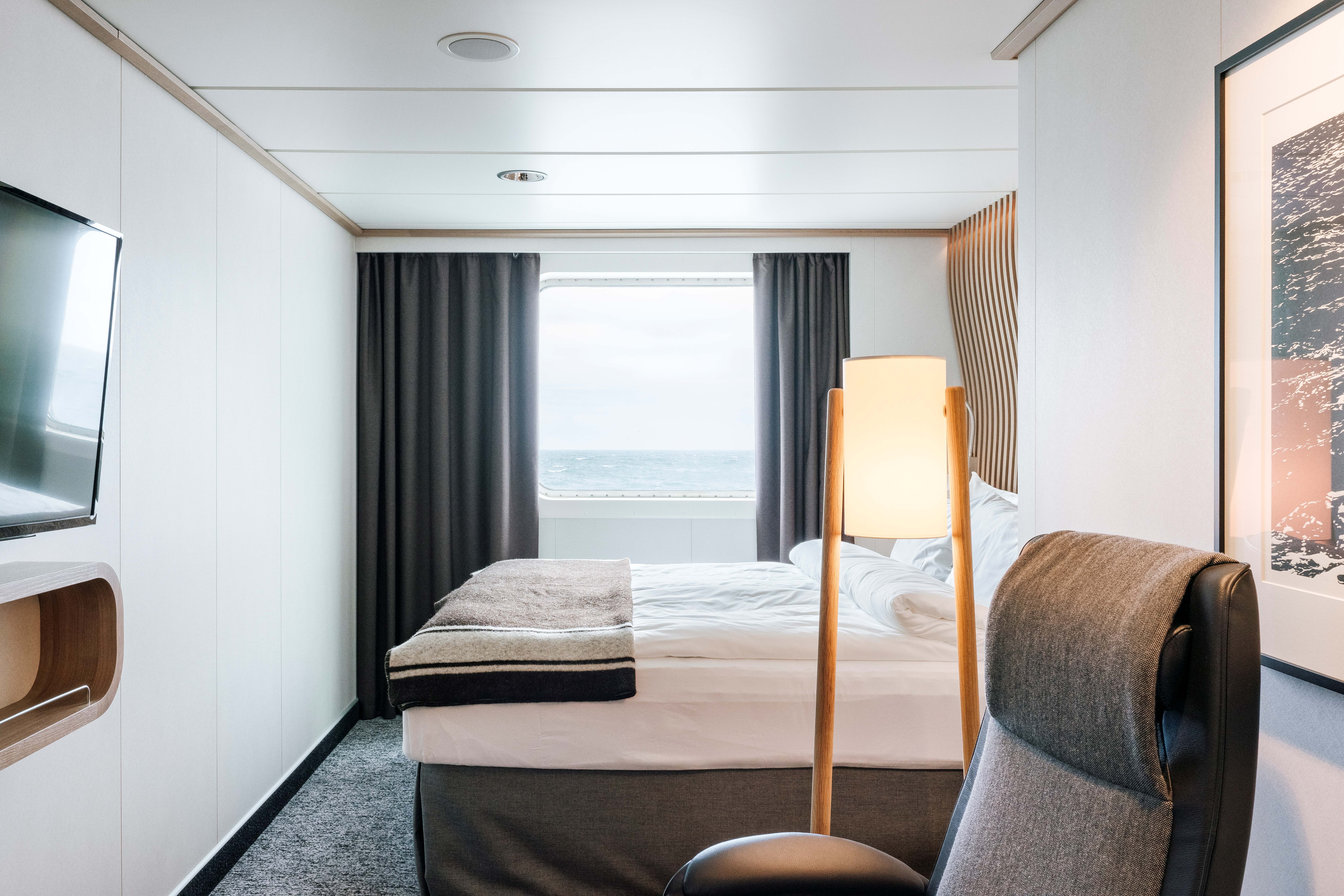Polar Outside kahytter, ligger spredt rundt på dækkene, nogle på nedre dæk og andre på mellemste og øverste dæk, alle med en hyggelig atmosfære. Alle kahytter har en dobbeltseng, der kan deles til to enkeltsenge efter anmodning på bestillingstidspunktet, nogle med sovesofa. Badeværelse med bruser & toilet og toiletartikler. TV, pengeskab, minibar (mod betaling). Europæiske to-polede stikkontakter, te-og kaffefaciliteter. Badekåbe og tøfler er gratis.