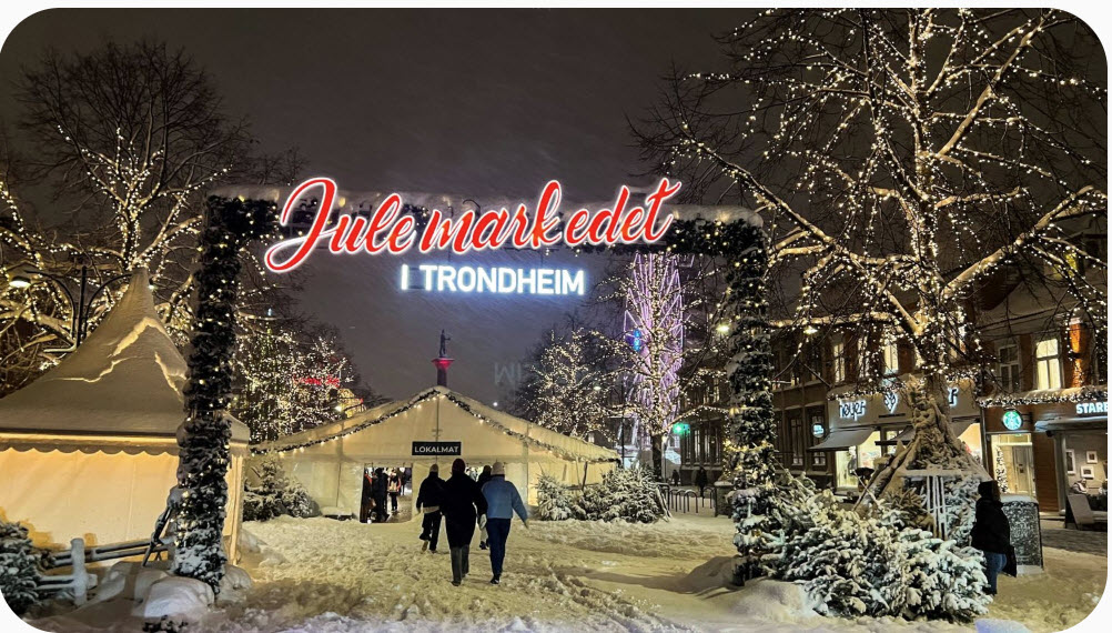 NIVEAU 2. Har får du oplevet Trondheim fra en anden side, vi skal besøge det hyggelige julemarked på Torvet, hvor der er afsat 45 minutter til at nyde den gode før julestemning med boder, julesmag i madboderne og lytte til julemusik. Men inden vi kommer dertil, går vi gennem Solsiden, over det julepyntede Bakklandet (Trondheims gamle bydel) og stopper ved Nidarosdomen, hvor vi får en præsentation af dens ydre. På tilbageturen ser vi nogle af Trondheims veiter (baggader), såsom Westermannsveita, hvor Lys tunnelen ligger. Vi går også langs dele af hovedgaden, Nordre gate, inden vi slentrer forbi det smukke Britannia Hotel. Derfra går turen tilbage til skibet.
