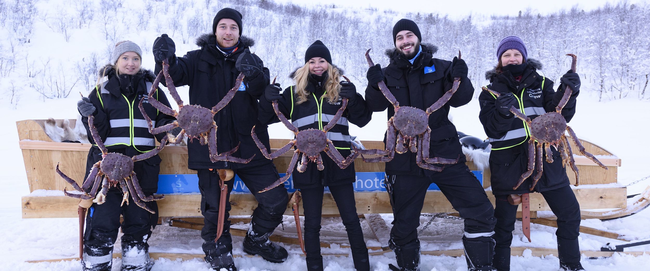 Ved basen bliver der mulighed for omklædning og sikkerhedsinstruktion, hvorefter vi kører på snescooter og slæder ud til fjorden. Her vil lokale fiskere møde os, hvor du får hjælp til trække krabberne op fra dybet. Kongekrabberne lever flere hundrede meter under isen på fjorden. Krabben har gigantiske ben som kan blive op til to meter fra tåspids til tåspids. Efter fangsten tager guiden os tilbage til en varm og rustik restaurant, hvor du smager den tilberedte krabbe. Kongekrabbens mørkerøde piggede skjold gemmer på et blødt, næsten sødt og helt hvidt krabbekød og severes på klassisk norsk måde: frisk, saftigt og helt uimodståeligt. UHM! Portionerne er heldigvis store, så du går ikke sulten fra bordet.
