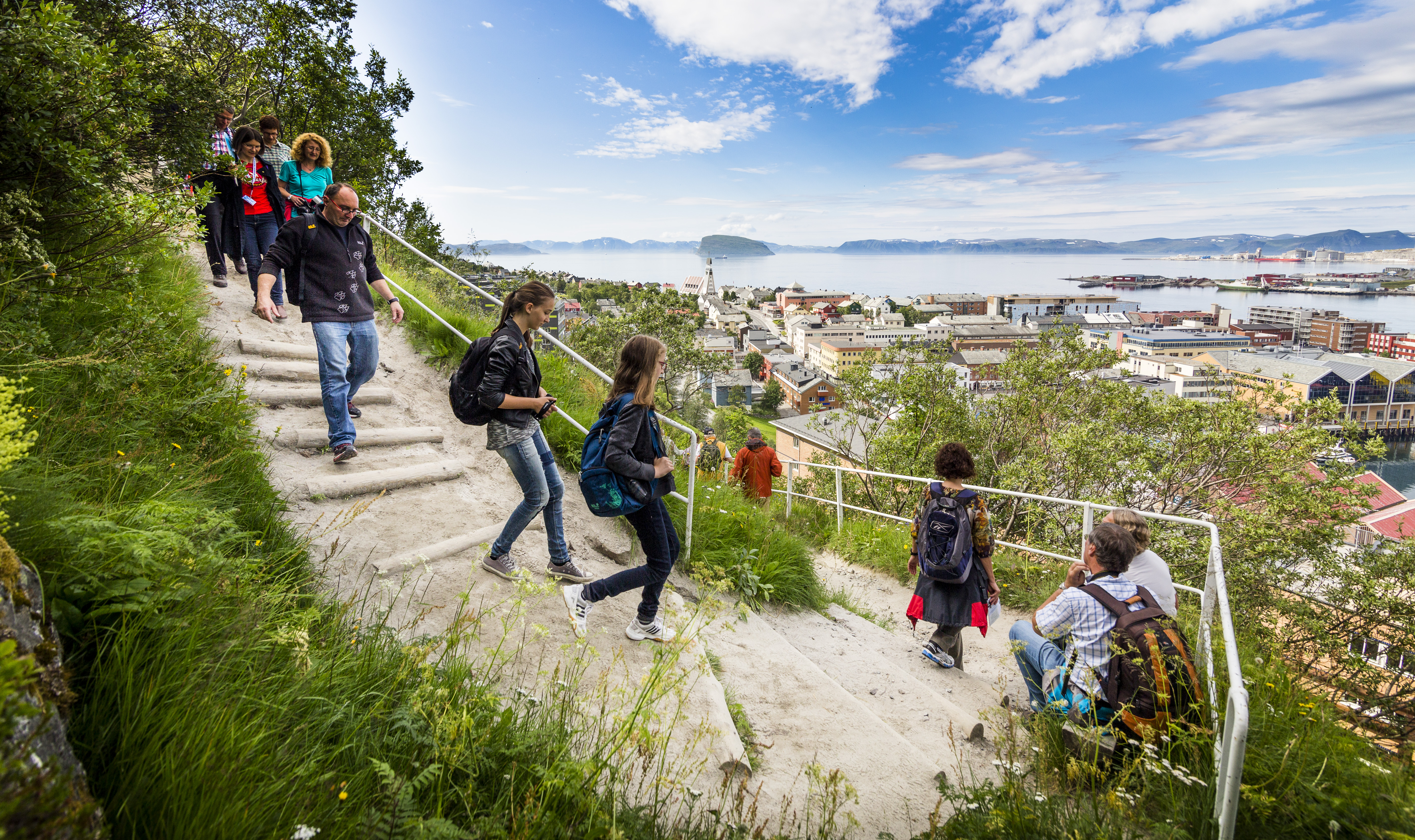 NIVEAU 4. Tag med på en vandretur i verdens nordligste by. Turen følger Gammelvejen, som blev anlagt som promenadevej i perioden 1896-98. Dette er en flot måde at opleve Hammerfest på. I løbet af turen vil du opleve flere af byens bedste udsigtspunkter. Der er en temmelig stejl stigning mod toppen, som kræver, at man er i god form. Godt oppe belønnes man med en fantastisk udsigt mod Melkøya, Sørøya og Seiland. Turen går videre forbi Hammerfests eneste skov - Jansvannskogen og til byfjeldet Salen, hvor man kan nyde udsigten over byen og Hurtigruten. Derefter går man zigzag ned af fjeldet og tilbage til skibet.