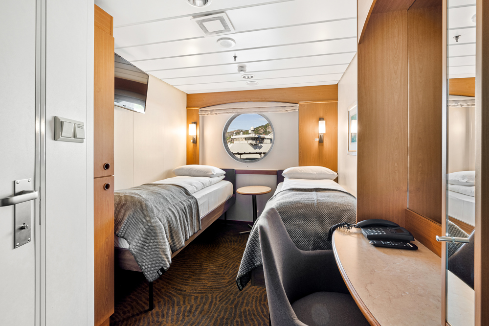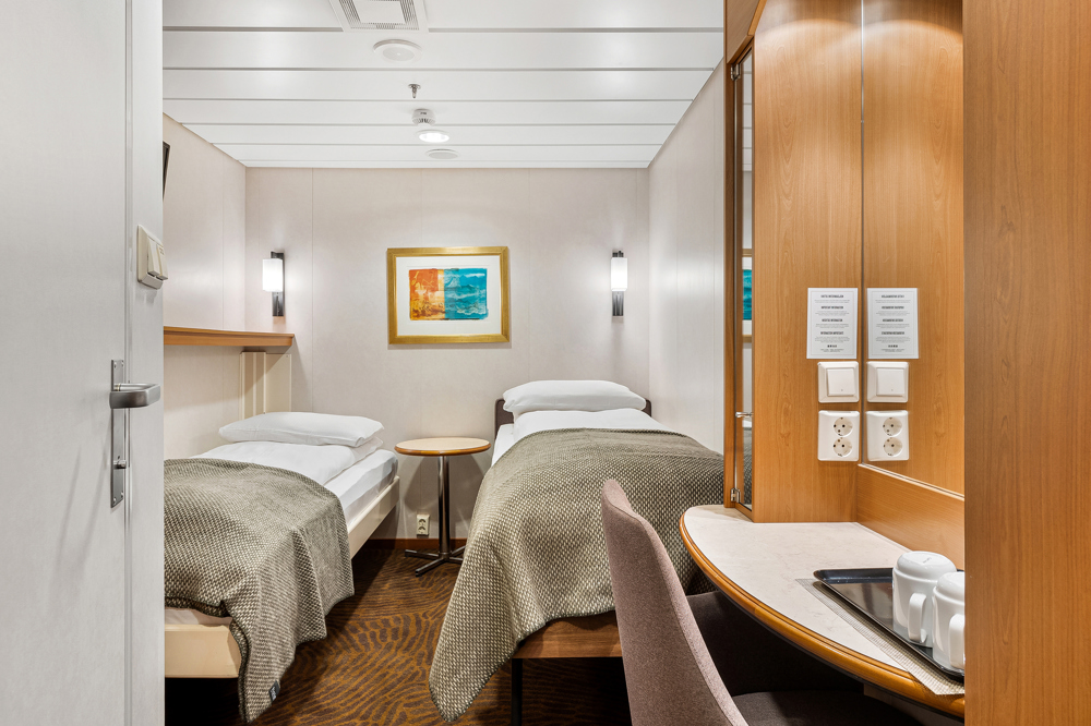 Indvendige kahytter, beliggende på nedre dæk og med en hyggelig atmosfære. Alle med badeværelse med brus/toilet. De fleste med separate senge, hvor en kan ændres til sofa. Enkelte har over- og underkøje. Nogen kahytter har flere faciliteter end andre