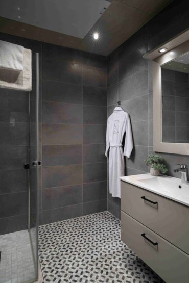 Romløsning og fasiliteter: Leiligheten har en effektiv ettromsløsning med en separat sovealkove. Hovedrommet er utstyrt med en komfortabel dobbeltseng, et fullt utstyrt kjøkken og en koselig spiseplass for to. Den åpne løsningen gjør det enkelt å lage mat, slappe av eller se på TV. I tillegg finner du hårføner og varmekabler på badet for ekstra komfort.