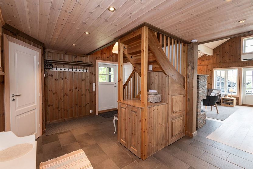 Hytte i 2 etager, 8 senge, 110 kvm, 4 soverum + åben hems. Åben planløsning med køkkenafdeling. Opholdsstue med pejs, siddegruppe, TV og spiseplads med borde og bænke til 8 personer. 1 bruser, 2 WC, 1 sauna. Terrasse. 3 P-pladser, ladestander mod betaling