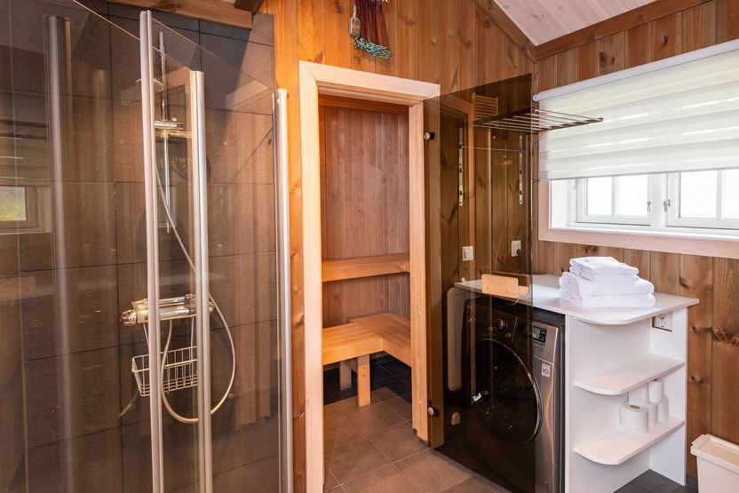 Bad 1 med bruser, WC, sauna. Bad 2: Ekstra WC