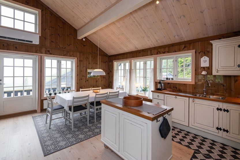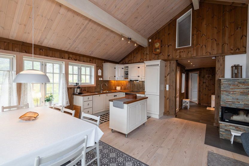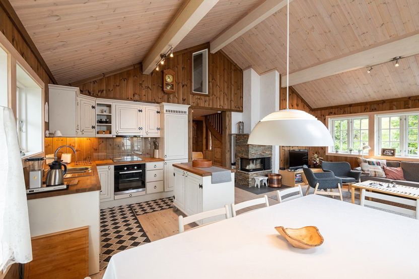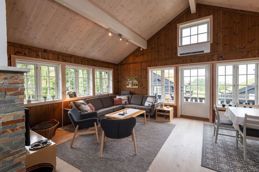 Opholdsrum med pejs, siddegruppe, TV, spiseplads borde og bænke til 8 personer. 3 parkeringspladser. Ladestander mod betaling Terrasse. Skibod.
