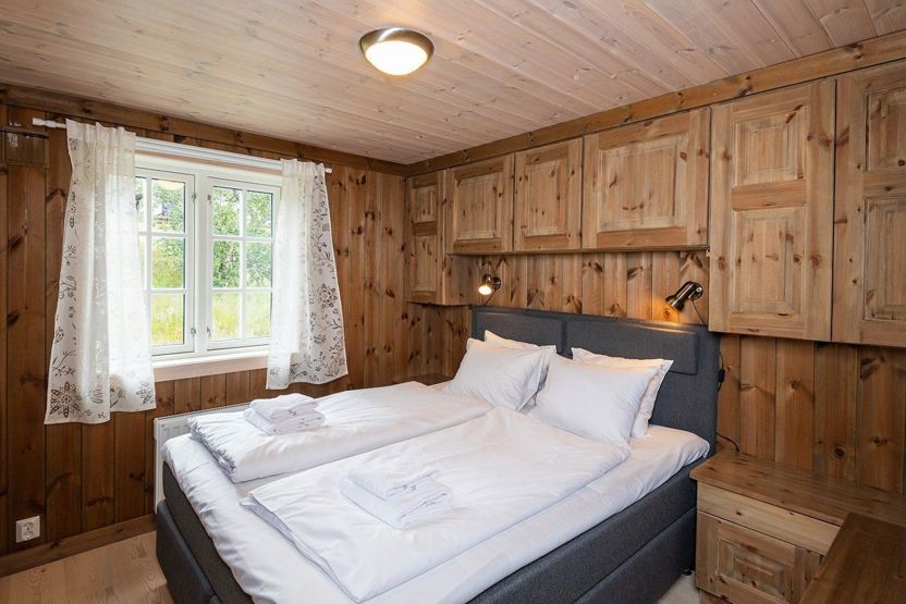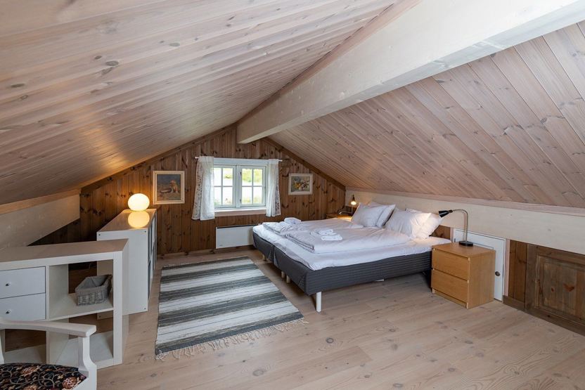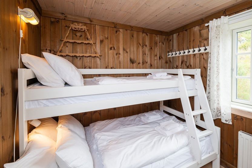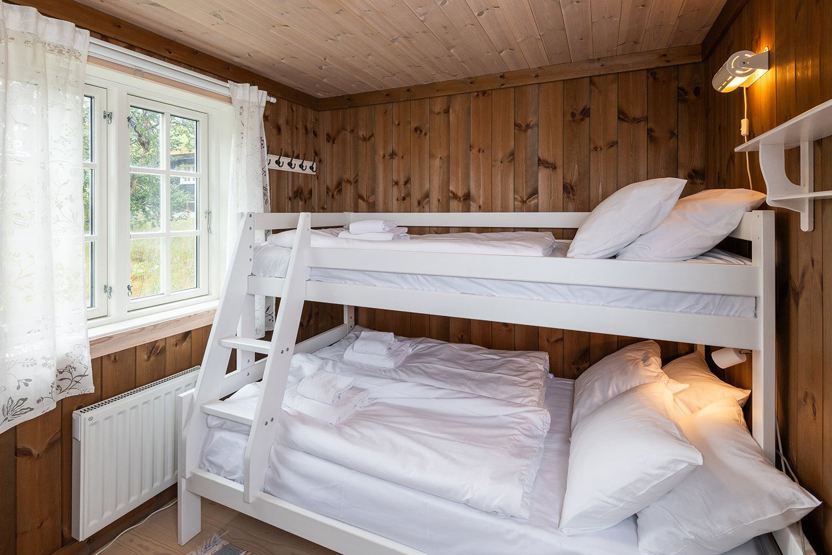 Soverum 1 = 1 dobbeltseng 160 cm. Soverum 2 + 3 = 1 familiekøjeseng 120 cm bred underkøje + 90 cm overkøje. Soverum 4 = Hems, åben lavloftet hems med 1 dobbeltseng 180 cm