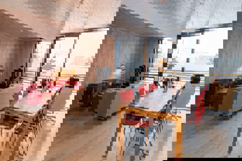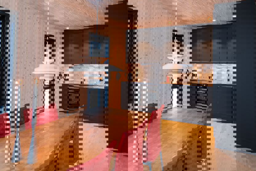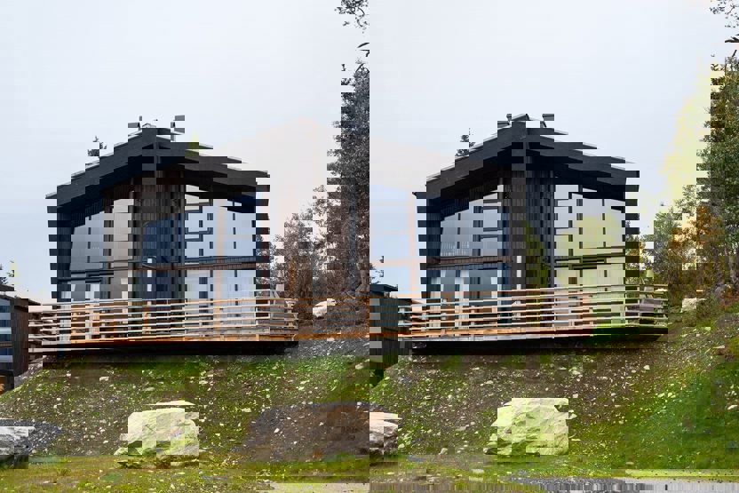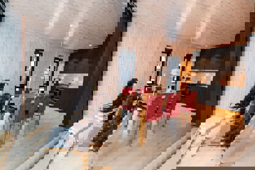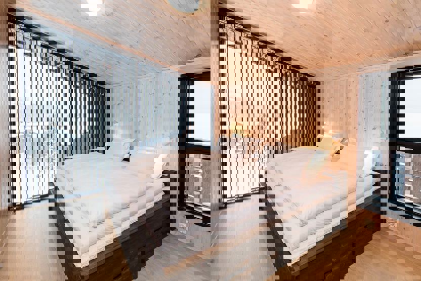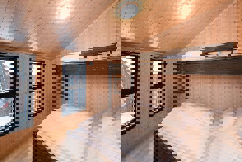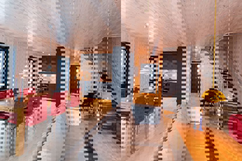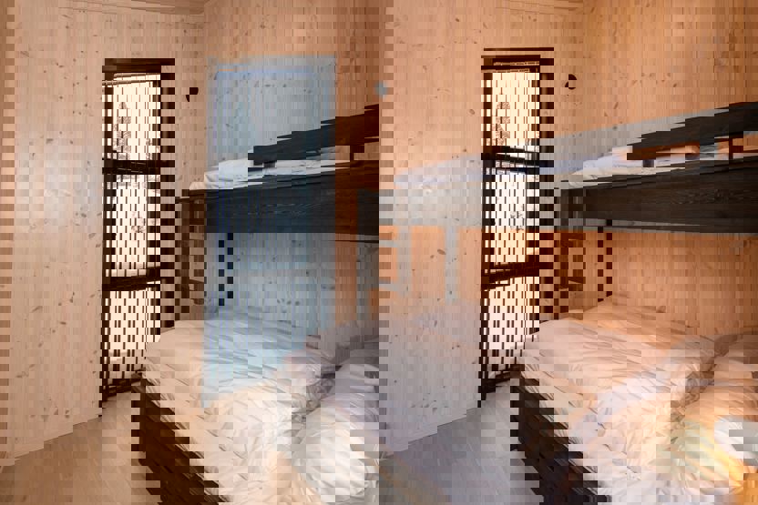 Hytte i 2 etager, 8+2 senge, 110 kvm, 4 soveværelser. Hytte med høj standard, designet med fokus på komfort og funktionalitet, hvilket gør dem ideelle til både par og familier. Åben planløsning med køkkenafdeling. Opholdsstue med pejs, TV, siddegruppe og spiseplads til 10 personer. 2 brusere, 2 WC. Balkon. Hytten er privatejet, interiør kan derfor variere.