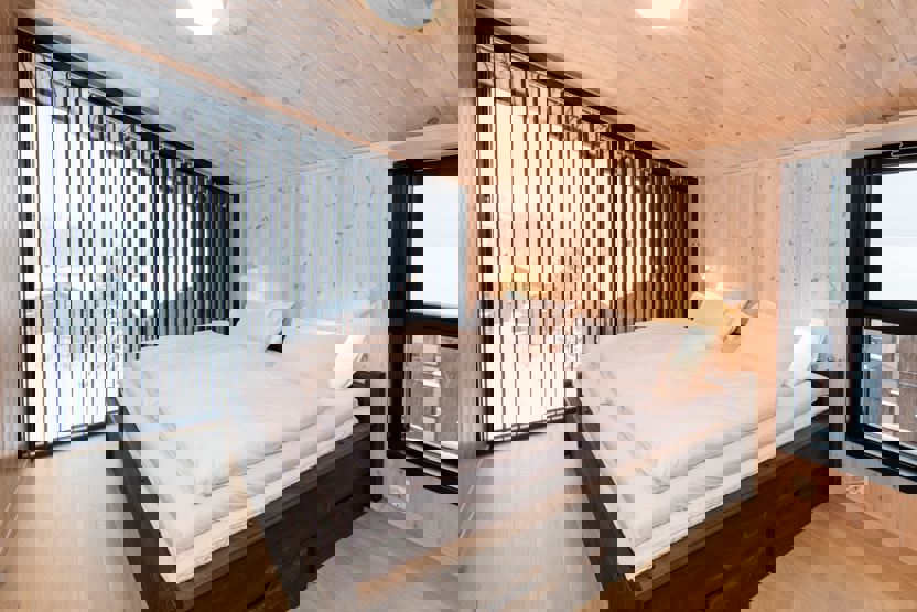Soverum 1 = 1 dobbeltseng 180 cm. Soverum 2 = 1 familiekøjeseng 180 cm bred underkøje + overkøje 90 cm. Soverum 3 = 1 familiekøjeseng 160 cm bred underkøje + overkøje 90. Soverum 4 = Sovesofa 140 cm bred