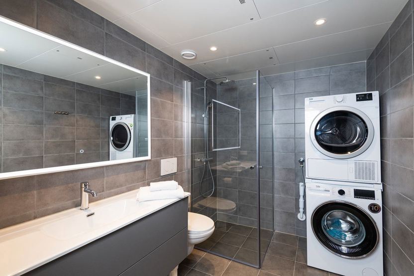 Badeværelser: Bad 1: 1 bruser, 1 WC, vaskemaskine. Bad 2: 1 bruser, 1 WC