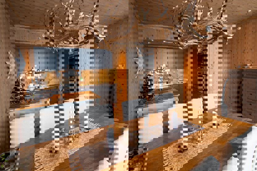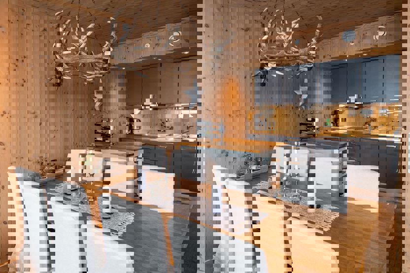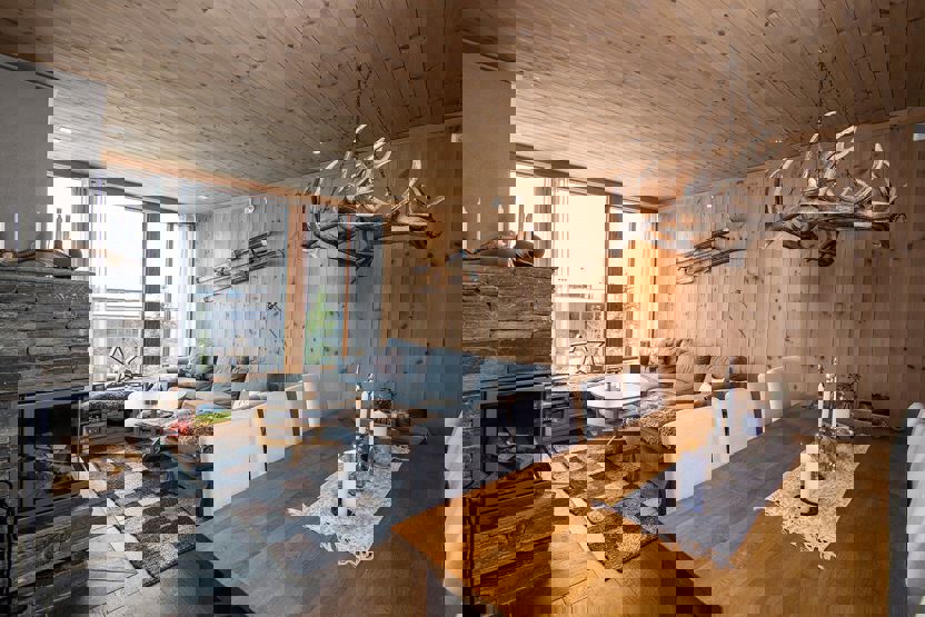 Lejligheden er indrettet med både komfort og funktionalitet, hvor mange af værelserne har store vinduer, der giver en betagende udsigt over de omkringliggende fjelde.