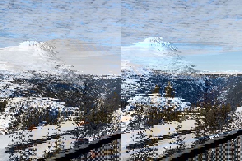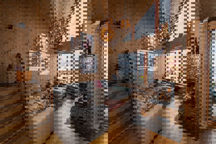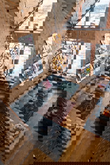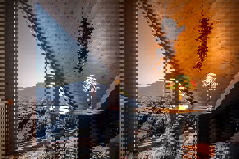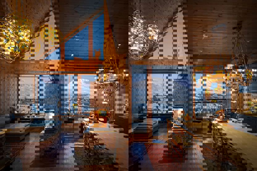 Lejligheden er indrettet med både komfort og funktionalitet, hvor mange af værelserne har store vinduer, der giver en betagende udsigt over de omkringliggende fjelde.