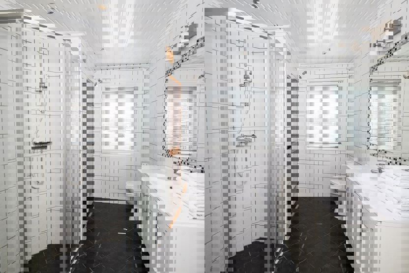Det fullt utstyrte kjøkkenet har alt du trenger, inkludert peis, dekketøy, komfyr, kjøleskap/fryser, oppvaskmaskin og kaffetrakter. I hovedstuen finner du en koselig sofa, TV og en varmende peis. I den andre stuen er det en sofa, TV og en ekstra seng. Begge badene er utstyrt med dusj og toalett, og det er også en vaskemaskin tilgjengelig i hytta.
