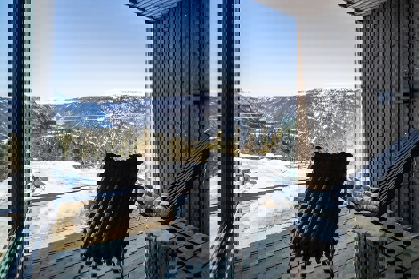 Opholdsrum med brændeovn, siddegruppe, TV, spiseplads til 6 personer. Balkon, skiskab.