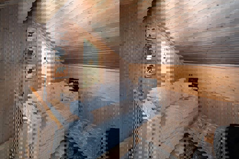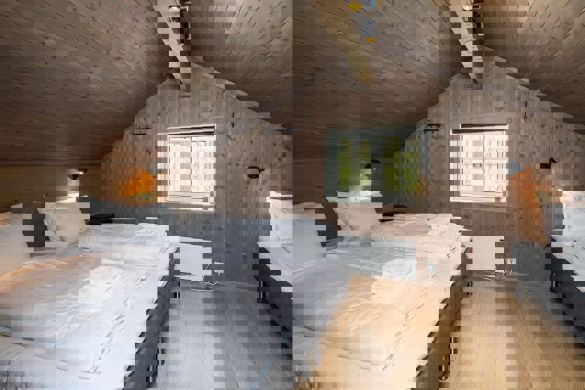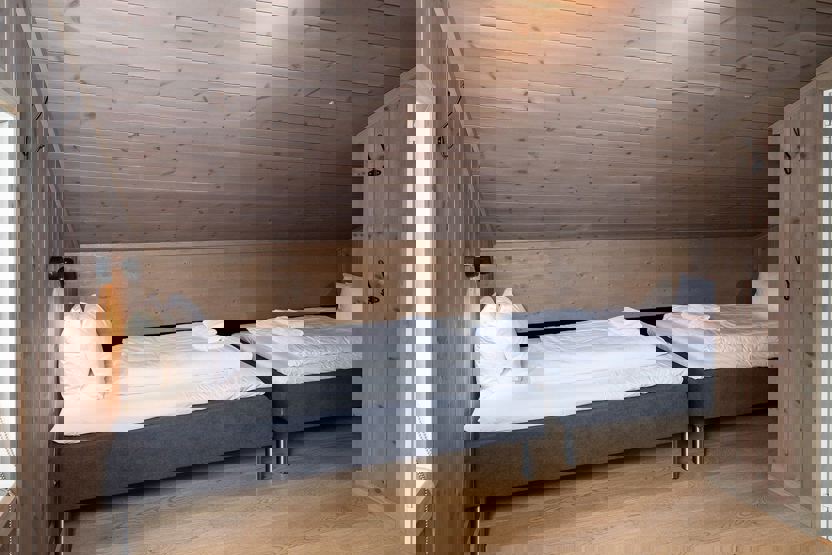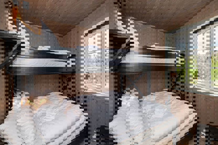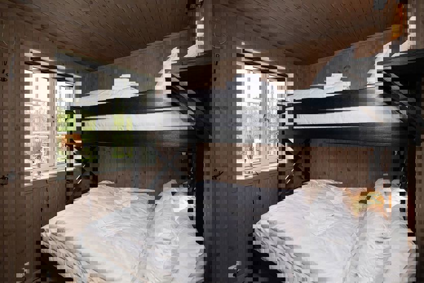 Soverum 1 = 1 dobbeltseng . Soverum 2 + 3 = 1 familiekøjeseng. 150 cm bred underkøje + 1 overkøje 90 cm. Soverum 4 hems: 1 dobbeltseng + 2 enkeltsenge / 2 sovesofa 140 cm brede