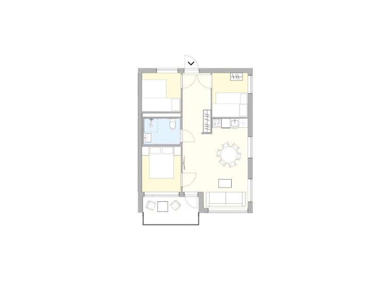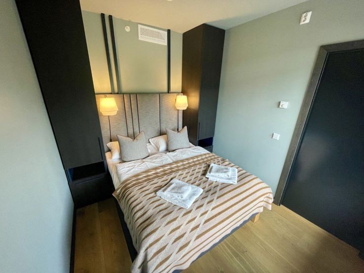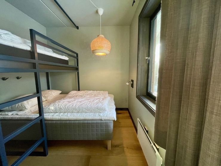 Denne store leiligheten på Gausta Sportell passer perfekt for familier eller grupper på opptil 8 personer. Den har tre soverom – ett med dobbeltseng og to med familiekøyer, hvor hver køye har plass til tre personer. Leiligheten har en koselig sittegruppe med sofa og stoler, en egen spiseplass med bord og stoler, samt et praktisk pentry med lite kjøleskap, stekeovn, vask og enkelt kjøkkenutstyr. Med privat balkong og skandinavisk design gjennom hele leiligheten, er dette et komfortabelt opphold bare noen meter fra skibakkene.