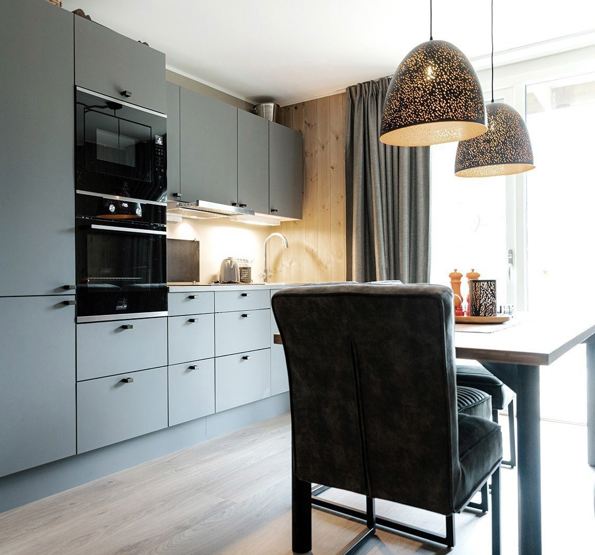 Køkkenet indeholder bl.a. køleskab, komfur med ovn, kaffemaskine, opvaskemaskine.