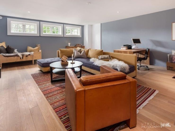 Kælderetage: 45 kvm stor kælderstue med sofa, stole og TV - børnenes favoritrum.