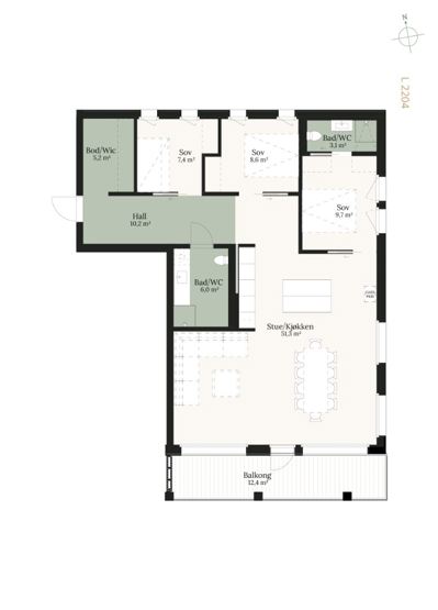 Kikut Alpin Lodge nr. 2204, 6+1 personer. Bygning 2. Lejlighed 102 kvm på 1 etage. 3 soveværelser. Åben stue og køkkenløsning med spiseplads til 8 personer. Opholdsstue med gaspejs, sofagruppe, TV. 2 brusere, 2 WC. Terrasse.