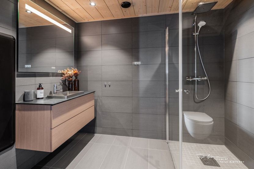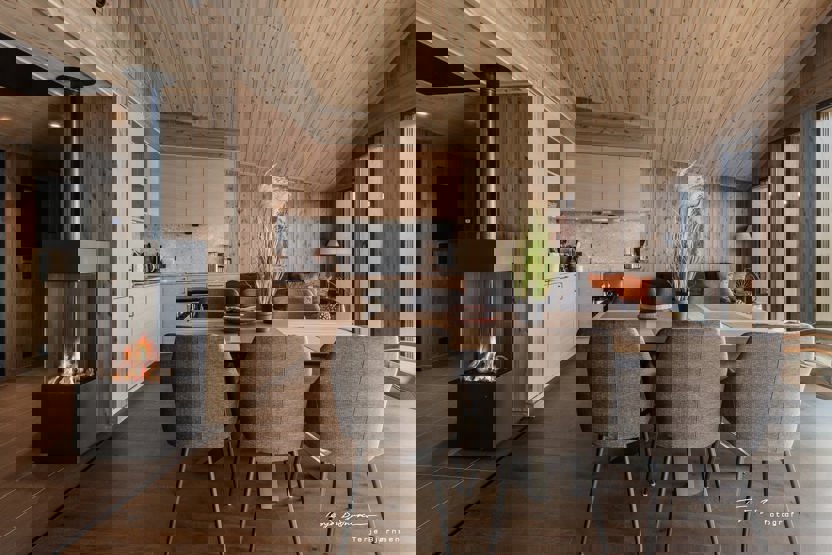 Leiligheten går over to plan. Leiligheten er innredet med åpen stue og kjøkkenløsning, har 3 soverom og 2 bad. Kjøkkenet er fullt utstyrt med spisebord og plass til 6 personer rundt bordet, oppvaskmaskin, kjøleskap/fryser, kaffetrakter, og vannkoker, børdrister og komfyr m/stekeovn. Stuen er innredet med sofa, TV og gasspeis som gir god varme til rommet på kalde vinterdager. I gangen er det god plass til å henge av seg klær. Innendørs parkering i garasjenalegg. Fra stuen har dere tilgang til terrasse. Begge bad er innredet med dusj og toalett. Det er ett bad i hver etasje.