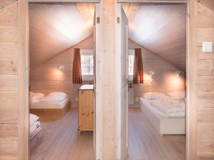 Standard hytte med 4 soverum - 10 personer. 117 kvm i 2 etager. Stor TV-stue med spiseafdeling og fuldt udstyret køkken. 2 badeværelser med bad og WC. Der er i alt 4 soveværelser: 2 soverum i stueetagen (1 dobbeltseng + 1 køjeseng) og 2 soverum på den lukket hems (1 med dobbeltseng og 1 med køjeseng). Brændeovn. Sauna, Støvletørre. Indretning kan variere.