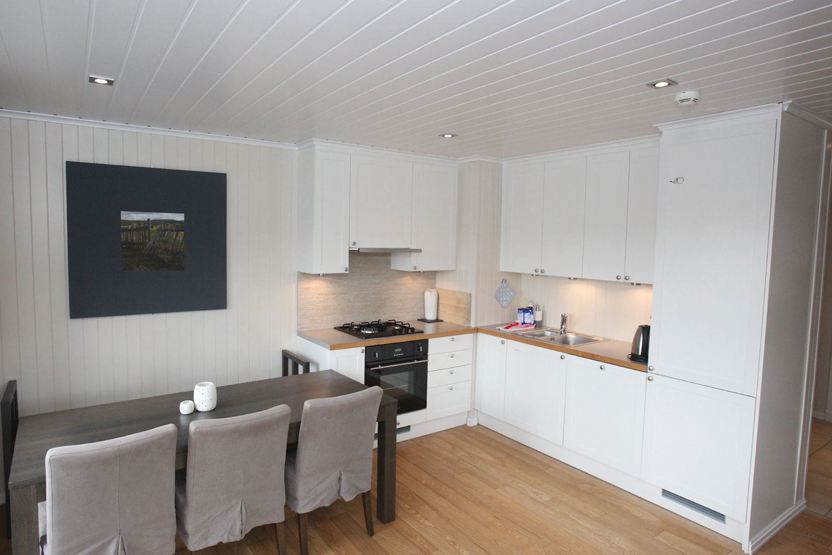 Havsdalsgrenda 6 sengs standard er moderne indrettet, fordelt over 2 etager. Lejligheden har plads til 6 personer, 55 kvm, 3 soveværelser. Åben planløsning med køkkenafdeling og opholdsstue med spiseplads til 6 personer, gaspejs, TV. 1 bruser, 1 WC. På 1. sal 3 soverum med skråvægge. Flot udsigt og interiør i stilfuldt nordisk design.