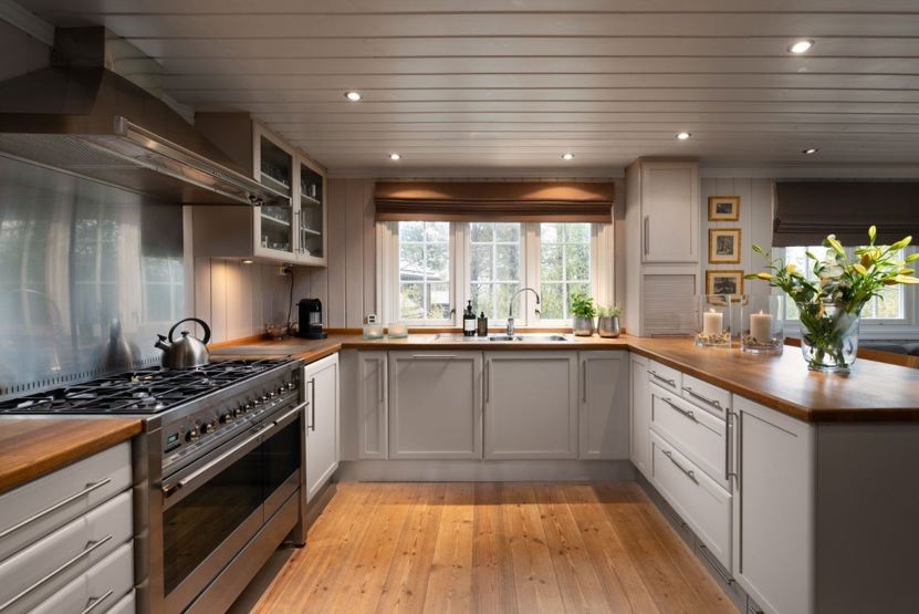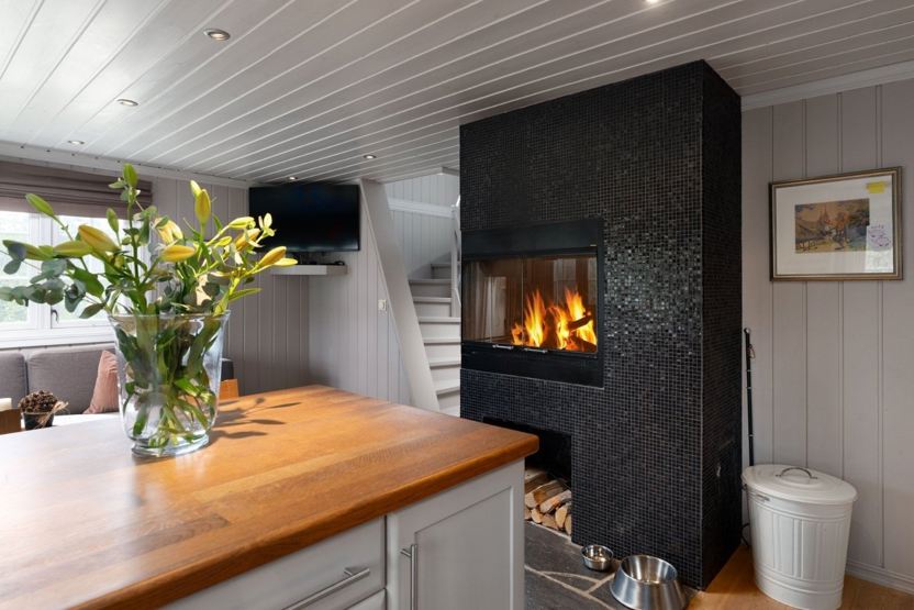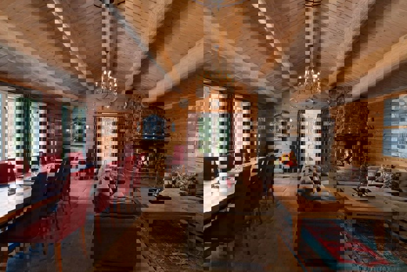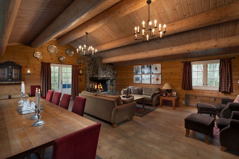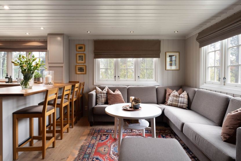 Hytta har en åpen kjøkkenløsning, flere sittegrupper til både film- og spillkvelder, spisebord og velutstyrt kjøkken.