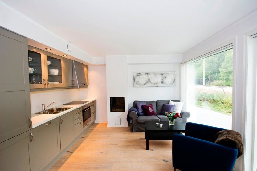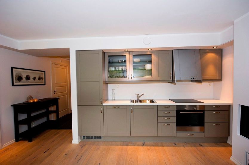 Køkkenet indeholder bl.a. køleskab, komfur med ovn, opvaskemaskine, kaffemaskine.