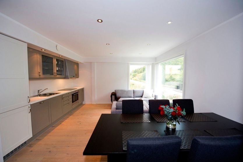 Køkkenet indeholder bl.a. køleskab, komfur med ovn, opvaskemaskine, kaffemaskine.