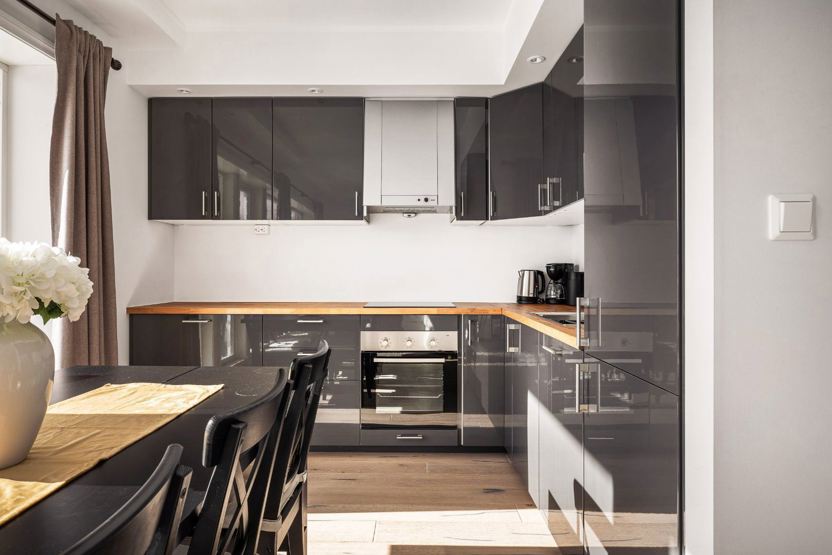 Køkkenet indeholder bl.a. køleskab, fryser komfur med ovn, opvaskemaskine, kaffemaskine.
