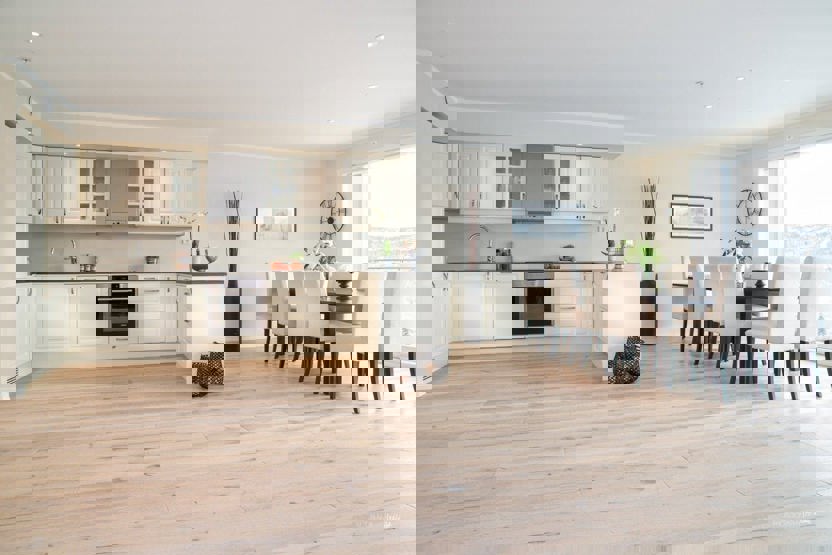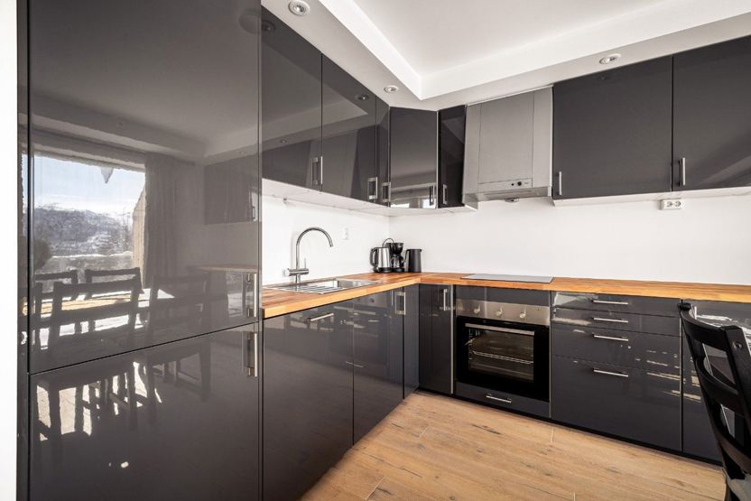 Køkkenet indeholder bl.a. køleskab, fryser komfur med ovn, opvaskemaskine, kaffemaskine.