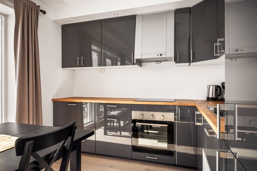 Køkkenet indeholder bl.a. køleskab, fryser komfur med ovn, opvaskemaskine, kaffemaskine.
