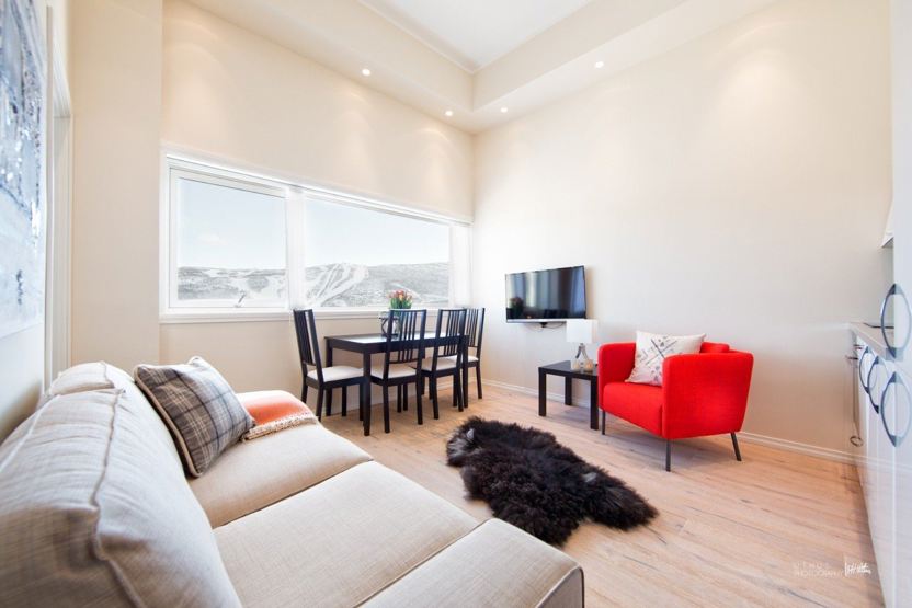 A Studio Leilighet med 1 Soverom ( inntil 4 personer ) ligger i Hotel bygget *Ca 35 m2 + hems *Leiligheten har åpen stue/kjøkken med trapp opp til hemsen og 1 soverom *Kjøkken med integrert komfyr, kjøleskap og oppvaskmaskin