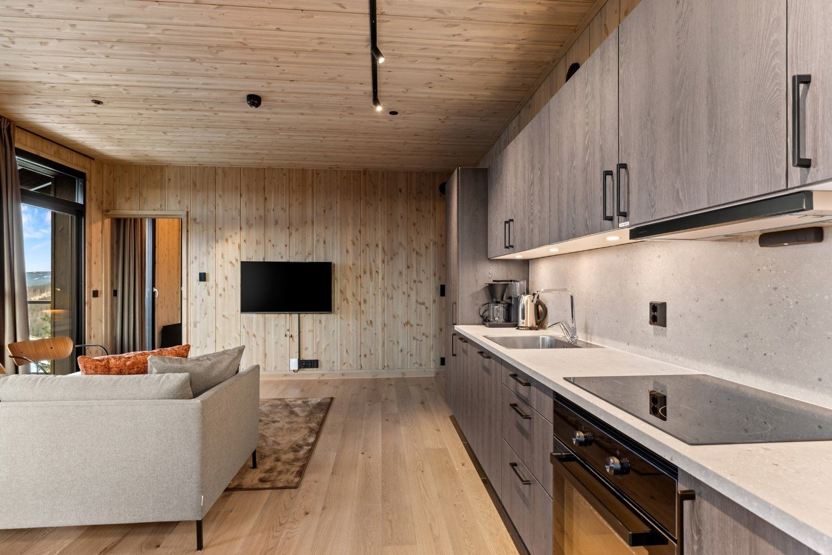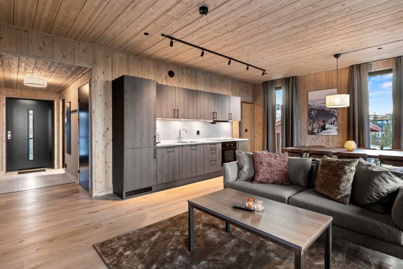 Favn Backyard 65G - 6+2 personer. Lejlighed på 76 kvm. 3 soveværelser. Åben planløsning med køkkenafdeling med spiseplads til 8 personer. Opholdsstue med TV og sofagruppe. 1 bruser, 2 WC, Balkon. Carport til en bil. Adgang til skibod. Lejligheden er privatejet og kan variere i Interiør. Alle billeder er illustrationsfoto, ændringer af interiør kan forekomme, lejligheder er under opførelse.