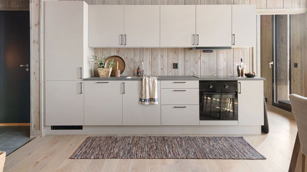 Enheden har komfur med ovn, opvaskemaskine, køleskab med fryser, kaffemaskine
