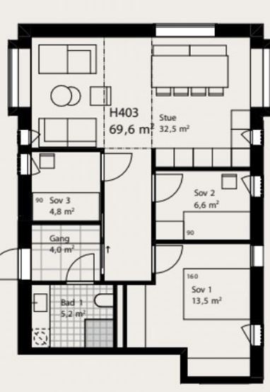 Soverum 1: 1 dobbeltseng (160cm x 200cm) Soverum 2: 1 køjeseng (90cm x 200cm) Soverum 3: 1 familiekøjeseng (140cm/90cm x 200cm)