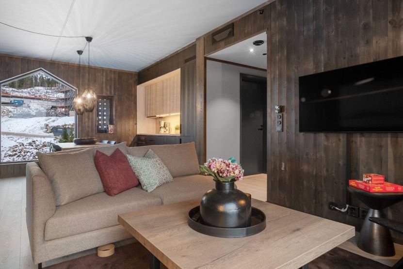 Favn Comfort A403 - 7 personer. Lejlighed på 70 kvm. 3 soveværelser. Åben planløsning med køkkenafdeling med spisebord til 8 personer. Opholdsstue med TV. 1 bruser, 1 WC. Skiskab. Udendørs parkering og elbilopladere mod betaling. Interiør kan variere.