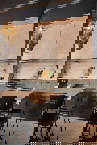 Enheden har komfur, ovn, køleskab med fryser, opvaskemaskine, kaffemaskine.