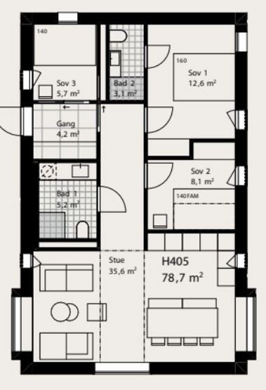 Soverum 1: 1 dobbeltseng (160cm x 200cm) Soverum 2: 1 dobbeltseng (140cm x 200cm) Soverum 3: 1 familiekøjeseng (140cm/90cm x 200cm)