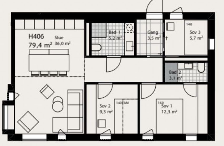 Bad 1: 1 Bruser, 1 WC Bad 2: 1 Bruser, 1 WC