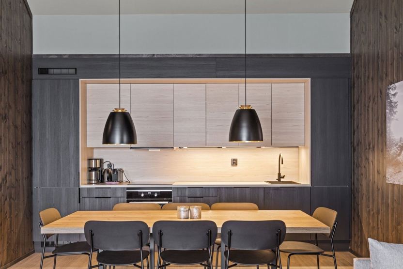 Favn Comfort B403 - 7 personer. Lejlighed på 70 kvm. 3 soveværelser. Åben planløsning med køkkenafdeling med spisebord til 8 personer. Opholdsstue med TV. 1 bruser, 1 WC. Skiskab. Udendørs parkering og elbilopladere mod betaling. Interiør kan variere.