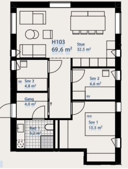 Soverum 1: 1 dobbeltseng (160cm x 200cm) Soverum 2: 1 køjeseng (90cm x 200cm) Soverum 3: 1 familie køjeseng (140cm/90cm x 200cm)