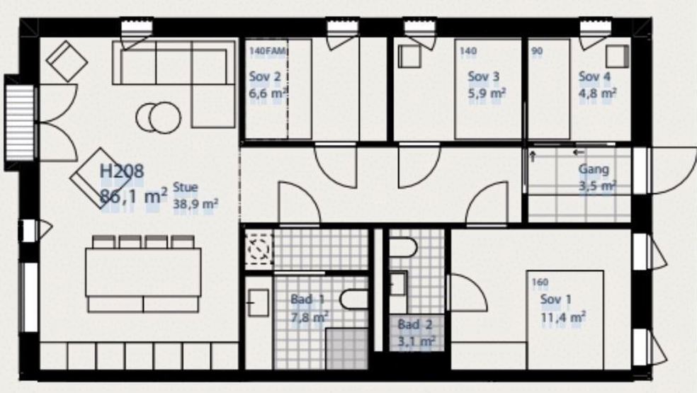 Bad 1: 1 bruser, 1 WC. Bad 2: 1 bruser, 1 WC
