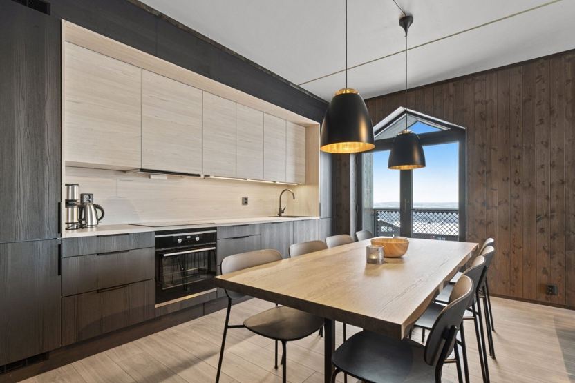 Enheden har komfur, ovn, køleskab med fryser, opvaskemaskine, kaffemaskine.