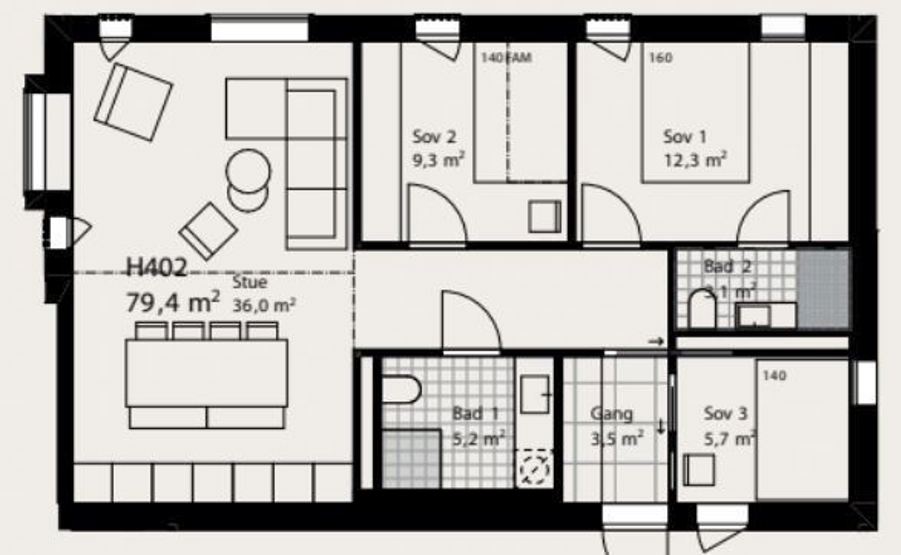 Soverom 3: Familiekøye (140cm / 90cm x 200cm)