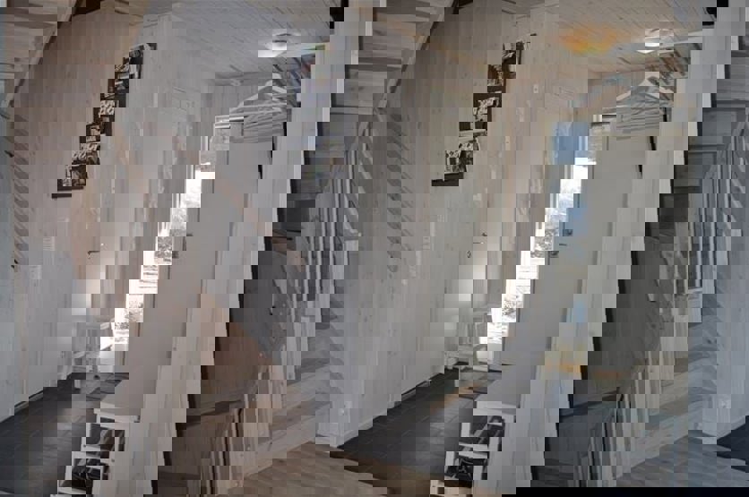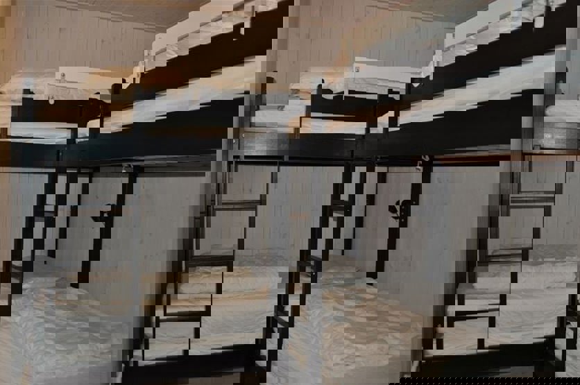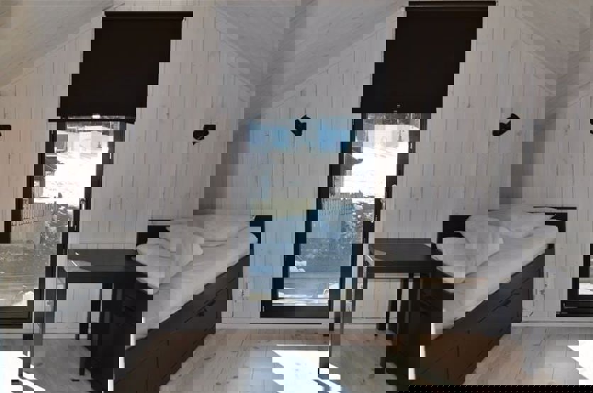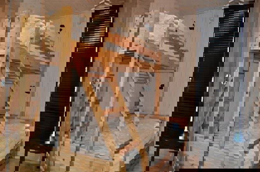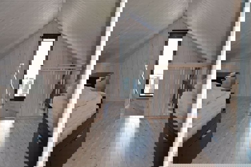 Soveværelse 1 + 2: 1 enkeltseng som kan trækkes ud til dobbeltseng + 1 enkeltseng 90 cm x 200 cm. Soveværelse 3: 1 familiekøjeseng 140 cm / 90 cm x 200 cm. Soveværelse 4: 2 køjesenge 90 cm x 200 cm Værelse 5 Hems: 1 dobbelt sovesofa