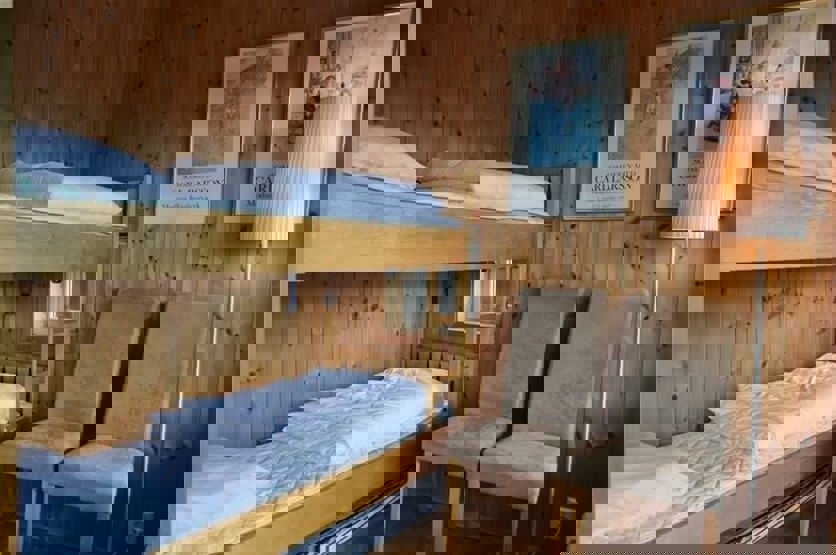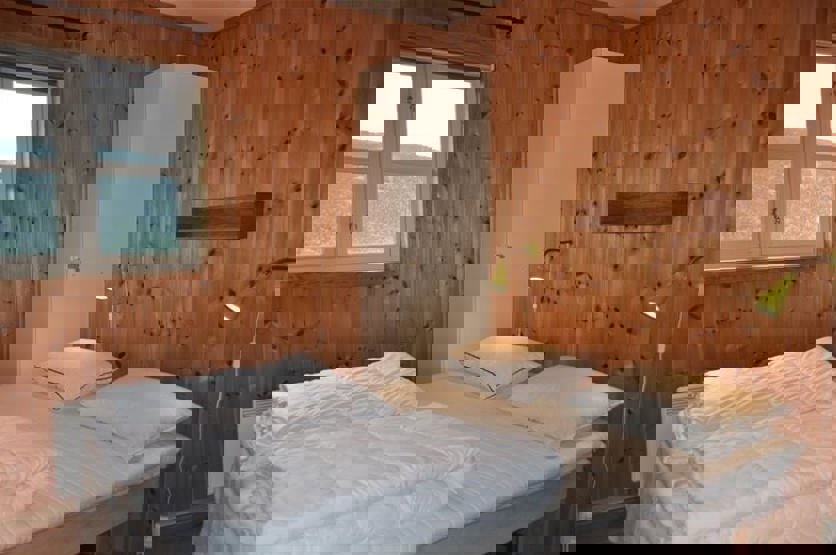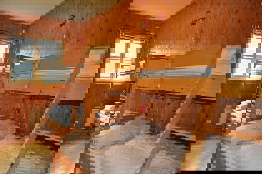 Soveværelse 1: 1 dobbeltseng (150 cm x 200) Soveværelse 2: 1 familiekøjeseng (120 cm/90 cm x 200 cm) + 1 køjeseng (90cm x 200 cm) Soveværelse 3: 1 køjeseng (90 cm x 200 cm) + 2 feldtsenge i hytten
