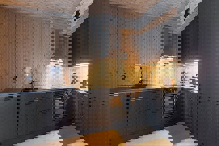Enheden har komfur, ovn, køleskab, fryser, opvaskemaskine, kaffemaskine.